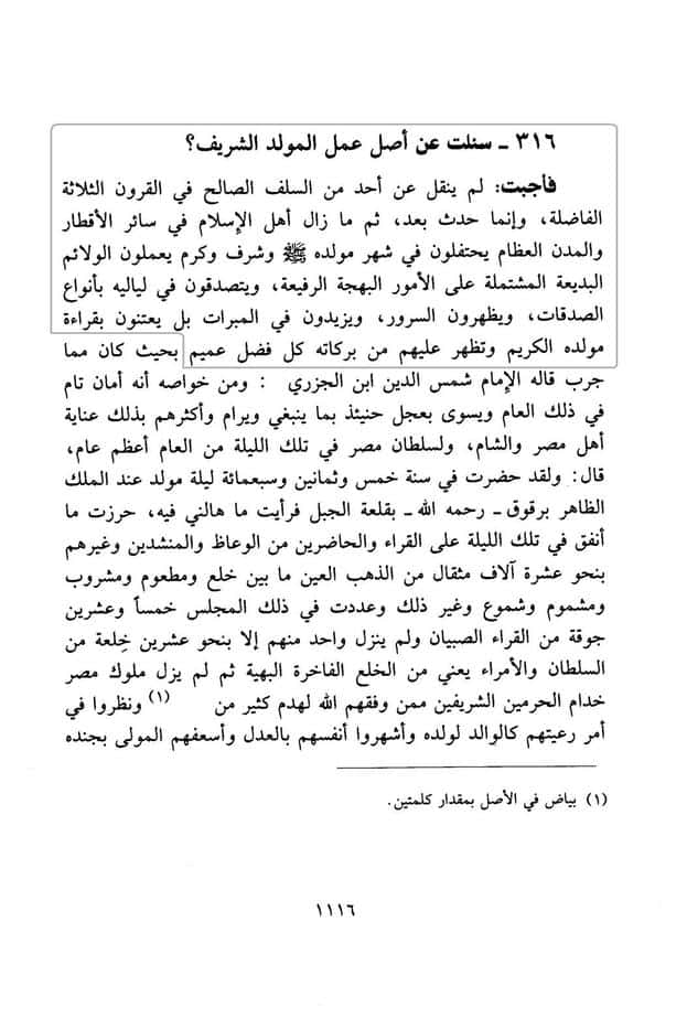 فأجبت: لم ينقل عن أحد من السلف الصالح في القرون الثلاثة الفاضلة، وإنما حدث بعد، ثم ما زال أهل الإسلام في سائر الأقطار والمدن العظام يحتفلون في شهر مولده صلى الله عليه وسلم وشرف وكرم يعملون الولائم البديعة المشتملة على الأمور البهجة الرفيعة، ويتصدقون في لياليه بأنواع الصدقات، ويظهرون السرور، ويزيدون في المبرات بل يعتنون بقراءة مولده الكريم وتظهر عليهم من بركاته كل فضل عميم »