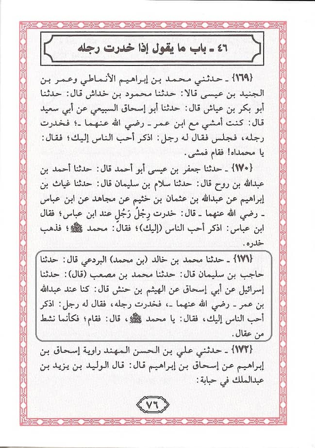 عن الهيثم بن حنش قال : ” كنا عند عبد الله بن عمر رضي الله عنهما فخدرت رجله ، فقال له رجل : اذكر أحب الناس إليك ، فقال : يا محمد صلى الله عليه وسلم ، فكأنما نشط من عقال »