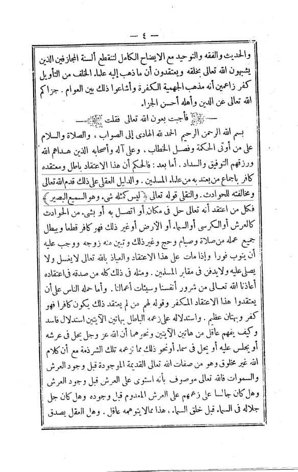 « قد سألني بعض الراغبين في معرفة عقائد الدين ، والوقوف على مذهب السلف والخلف في المتشابه من الآيات والأحاديث بما نصه :ما قول السادة العلماء حفظهم الله تعالى فيمن يعتقد أن الله عز وجل له جهة !! وأنه جالس على العرش في مكان مخصوص !! ويقول : ذلك هو عقيدة السلف »