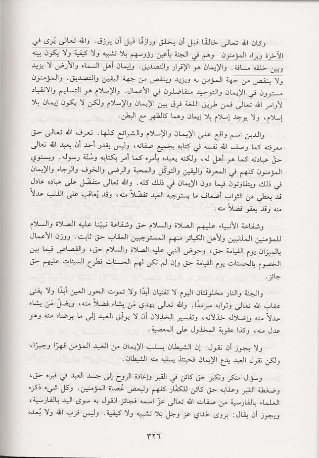 « Allâh ta’âlâ sera vu dans l’au-delà, les croyants Le verront alors qu’ils seront eux au paradis, avec les yeux de leur tête, sans aucune ressemblance et sans comment, et il n’y aura pas de [notion de] distance entre Lui et Ses créatures »