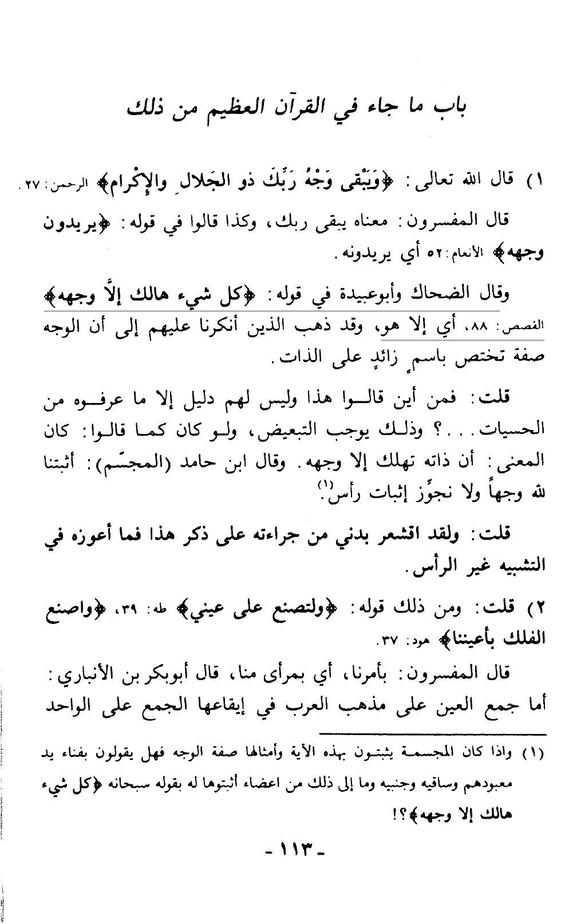 – Le fait de prendre ce verset et ceux de ce type selon le sens apparent (c’est-à-dire le sens du visage) est la voie des anthropomorphistes (mouchabbihah).