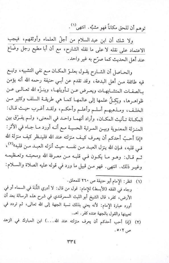 – Ici, l’Imâm Aboû Hanîfah considère qu’attribuer un endroit à Allâh est de la mécréance. Et sa parole est confirmée par deux grands savants : Chaykhou l-Islâm Ibnou ‘Abdi s-Salâm et le Chaykh Moullâ ‘Ali Al-Qârî. Cette explication de la parole de l’Imâm Aboû Hanifâh a été également été confirmée par l’Imâm As-Samarqandi Al-Hanafi [voir l’article : ici], par l’Imâm Al-Bayâdi Al-Hanafi, par le Chaykh Taqiyyou d-Dîn Al-Hisni et autres.