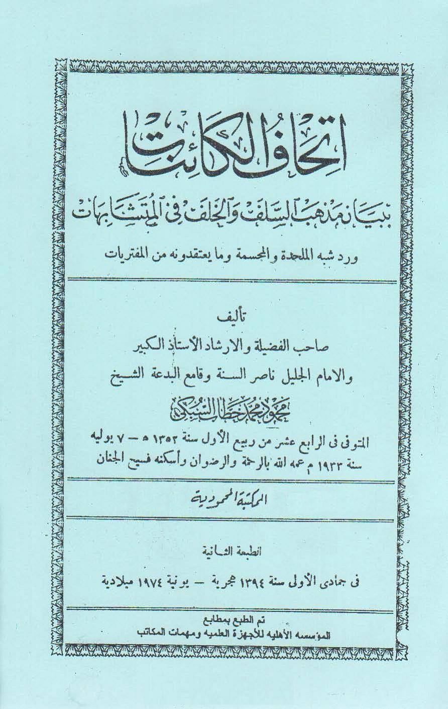 Dans son ouvrage « Ithâfou l-Kâ-inât bi-bayâni s-salaf wa l-khalaf fi l-moutachâbihât », le Chaykh Mahmoûd As-Soubki Al-Azhari a rédigé une longue fatwâ, qu’il a introduit en disant :