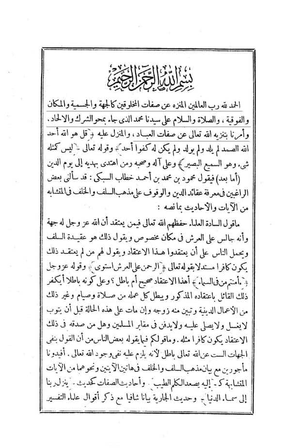 « بسم الله الرحمن الرحيم الحمد لله رب العالمين ، المنـزه عن صفات المخلوقين ، كالجهة والجسمية والمكان والفوقية ، والصلاة والسلام على سيدنا محمد ، الذي جاء بمحو الشرك والإلحاد وأمرنا بتنـزيه الله تعالى عن صفات العباد »