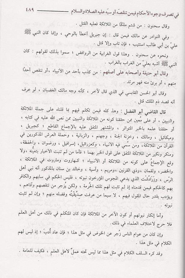 - Le Chaykh Ibn Farhoûn qui a dit : «Celui qui insulte un prophète ou l’un de parmi les anges, sa conséquence est la même que celui qui insulte le prophète (salla l-Lâhou ‘alayhi wa sallam) […] comme Jibrîl, Mîkâ-îl et ‘Azrâ-îl» [Dans son livre Tabsiratou l-Houkkâm] ;