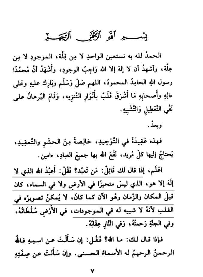 – Il a dit dans l’introduction de son ouvrage : « Voici un traité de croyance concernant le tawhîd pur de tout verbiage et de toute complication dont a besoin tout mourîd, que Allâh en fasse profiter tous les esclaves, âmîn »