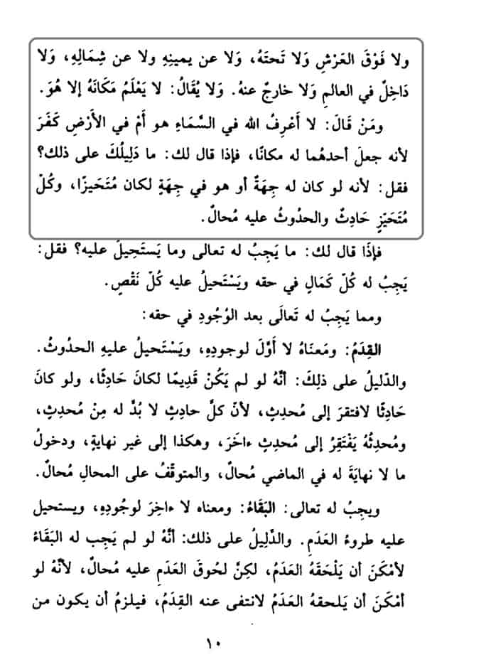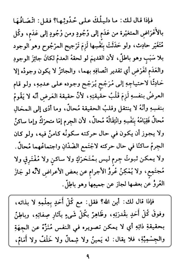 Si maintenant on te demande : « Quelle est ta preuve en cela ? Réponds : « Parce que s’Il avait une direction ou s’Il était dans une direction, Il serait localisé et tout ce qui est localisé est entré en existence alors que l’entrée en existence est impossible à Son sujet »