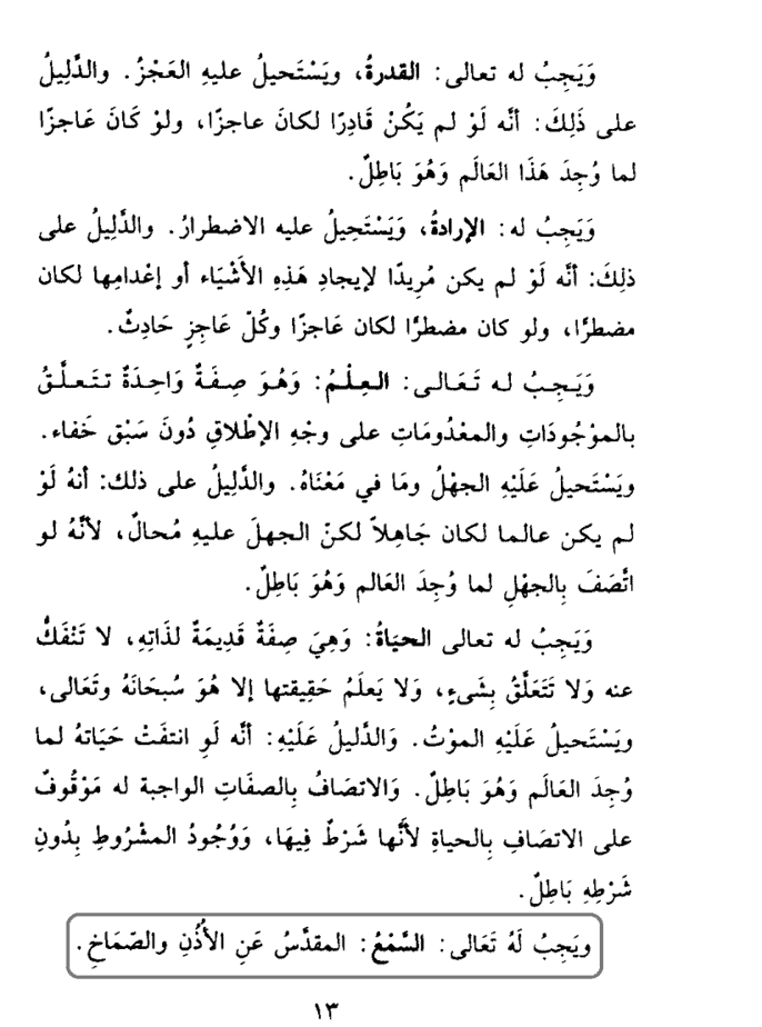 « ويجبُ له تعالى: السمعُ: المقدَّسُ عن الأُذُنِ والصِماخ.»