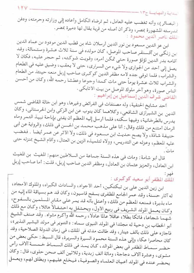 « Il organisait – il vise le roi Al-Moudhaffar – le Mawlid honoré au mois de Rabî’ou l-Awwal et le fêtait par une festivité grandiose. Il était magnanime, courageux, brave, sage, savant et juste, que Allâh lui fasse miséricorde et qu’Il honore pour lui sa demeure dans l’au-delà. Le chaykh Abou l-Khattâb Ibnou Dihyah a composé pour lui un livre sur la naissance du Prophète qu’il a intitulé : « At-Tanwîr fi Mawlidi l-Bachîri n-Nadhîr » ; il l’a récompensé pour cela de mille dinars. L’époque de son règne s’est prolongée jusqu’à ce qu’il meurt alors qu’il faisait le siège des croisés dans la ville de ‘Akkâ en l’an six-cent-trente et il était alors louable de conduite et de fond de cœur ».