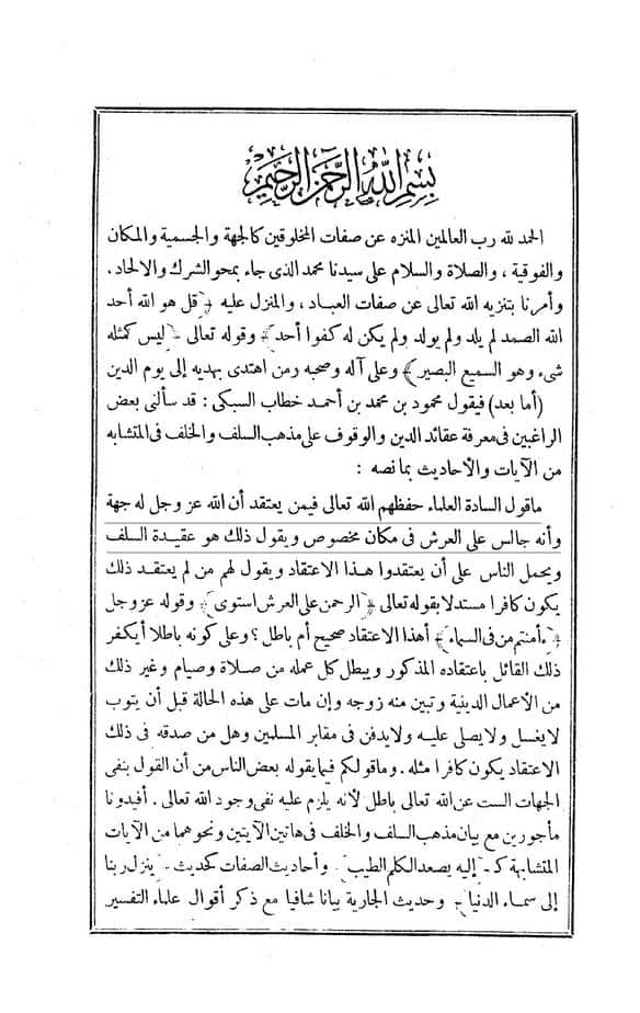« قد سألني بعض الراغبين في معرفة عقائد الدين ، والوقوف على مذهب السلف والخلف في المتشابه من الآيات والأحاديث بما نصه :ما قول السادة العلماء حفظهم الله تعالى فيمن يعتقد أن الله عز وجل له جهة !! وأنه جالس على العرش في مكان مخصوص !! ويقول : ذلك هو عقيدة السلف »