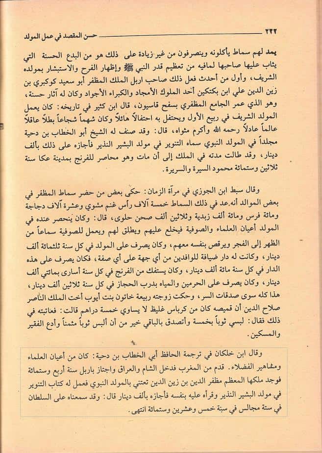 « وقال ابن خلكان في ترجمة الحافظ أبي الخطاب بن دحية : كان من أعيان العلماء ومشاهير الفضلاء ، قدم من المغرب ، فدخل الشام والعراق واجتاز بإربل سنة أربع وستمائة ، فوجد ملكها المعظم مظفر الدين بن زين الدين يعتني بالمولد النبوي ، فعمل له كتاب التنوير في مولد البشير النذير ، وقرأه عليه بنفسه ، فأجازه بألف دينار »