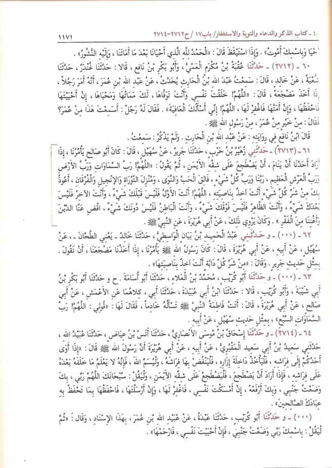 « Ô Allâh, Seigneur des cieux, Seigneur de la terre et Seigneur du Trône Eminent, notre Seigneur et le Seigneur de toute chose, Celui Qui fend la graine et le noyau, Celui Qui a fait descendre la Torah, l’Evangile et le Fourqân (le Qour-ân). Je recherche Ta protection contre le mal de toute chose. Allâh, Tu es Al-Awwal, rien n’est avant Toi et Tu es Al-Âkhir, rien n’est après Toi. Tu es Adh-Dhâhir, rien n’est au-dessus de Toi et Tu es Al-Bâtin, rien n’est en dessous de Toi. Rembourse nos dettes et enrichis nous contre la pauvreté »