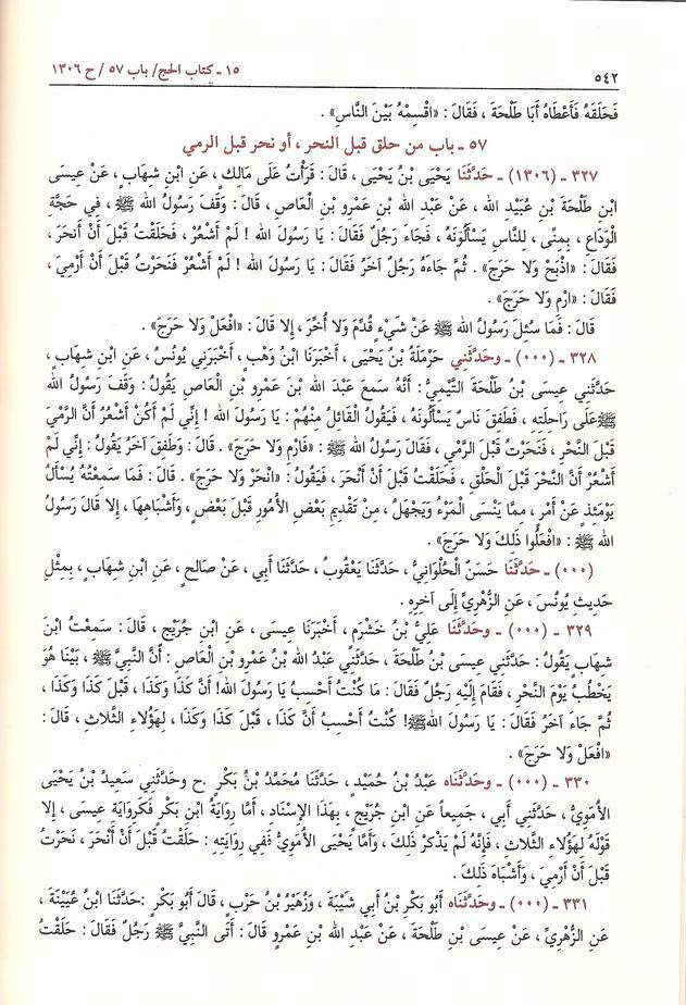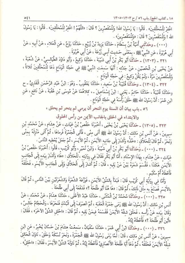 « Une fois accomplis le lancer à Jamrah (Al-‘Aqabah) et l’égorgement de son offrande, le Prophète (صلى الله عليه وسلم), lors de son rasage rituel, a tendu au barbier la partie droite de sa tête. Celui-ci l’a rasée puis il a appelé Aboû Talhah Al-Ansâri et lui a donné les cheveux. Ensuite, le Prophète a tendu au barbier la partie gauche de sa tête et lui a dit : « Rase ». Il a donc rasé. Le Prophète a donné les cheveux à Aboû Talhah et lui a dit : « Distribue-les aux gens » »