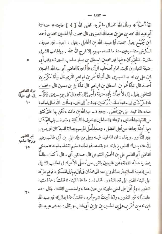 « J’ai entendu Ach-Châfi’i dire : je fais certes le tabarrouk (la recherche de bénédiction) par Aboû Hanîfah et je me rends à sa tombe chaque jour (le visiter). Si j’ai un besoin, j’accomplis deux rak’ah (cycles de prière) puis je me rends à sa tombe et je demande à Allâh ta’âlâ qu’Il m’accorde la chose dont j’ai besoin et ce, auprès de sa tombe. Après cela mon affaire est rapidement réglée »