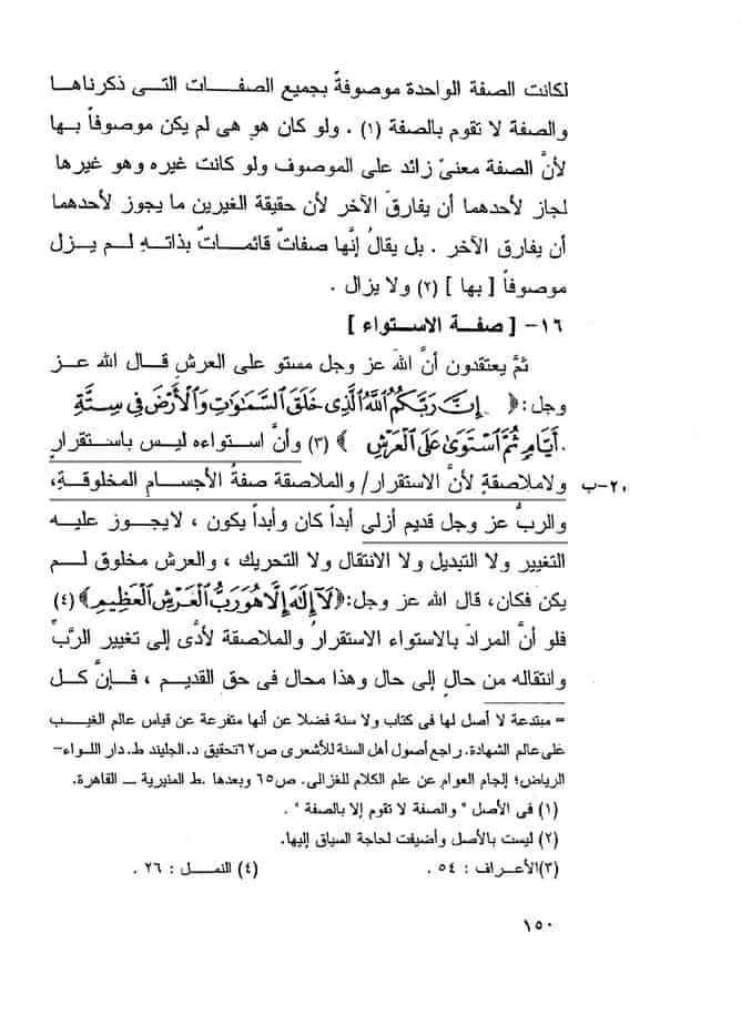 « Son istiwâ n’est pas un établissement ni le fait d’être en contact, car l’établissement et le fait d’être en contact sont des caractéristiques des corps qui sont donc créés alors que le Seigneur, ‘azza wa jall, est de toute éternité ».
