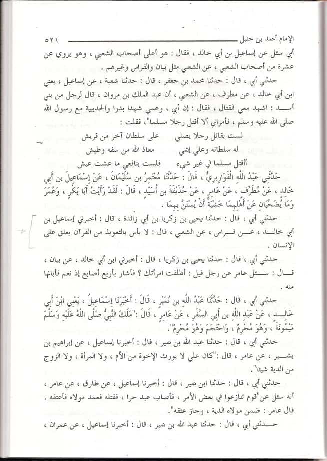 في كتاب معرفة العلل وأحكام الرجال عن عبد الله بن أحمد بن حنبل قال: حدثني أبي, قال: حدثنا يحيى بن زكريا بن أبي زائدة, قال: أخبرني إسماعيل بن أبي خالد, عن فراس, عن الشعبي قال: لا بأس بالتعويذ من القرءان يعلق على الإنسان
