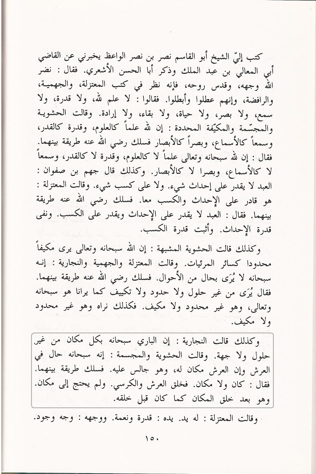 « De même, les « Najjâriyah » disent que le Créateur, qu’Il soit exalté, est dans tous les endroits sans qu’Il soit diffus et sans direction, tandis que les « hachawiyyah » et les « moujassimah » disent qu’Il est présent sur le Trône, que le Trône est son endroit, et qu’Il est assis dessus. »