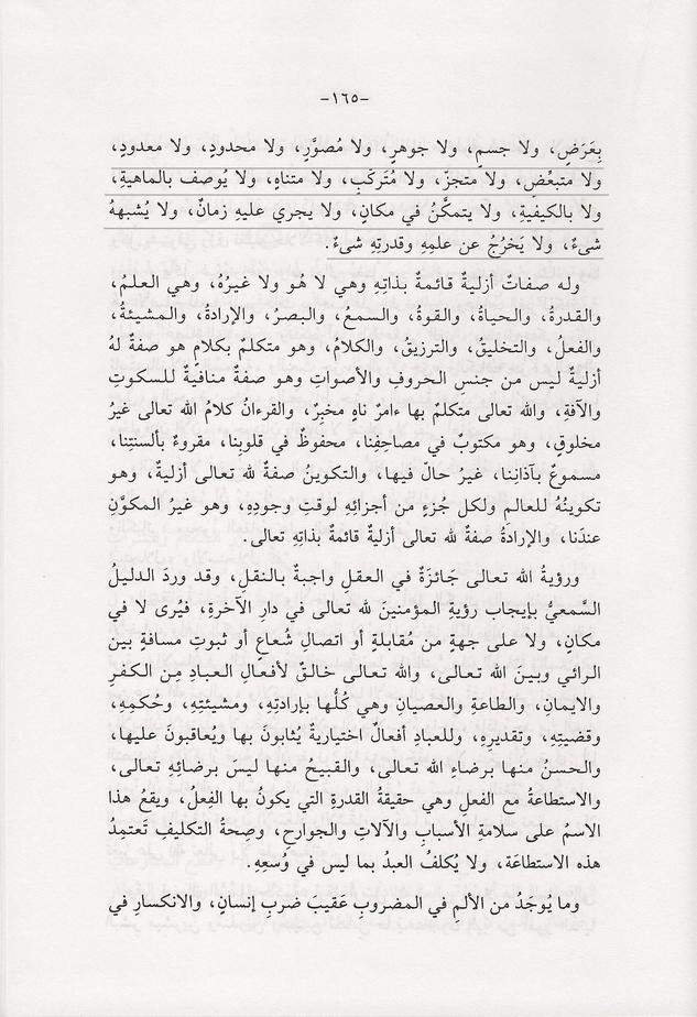 «والمحدِثُ للعالم هو الله تعالى الواحدُ القديمُ الحيُّ القادرُ العليمُ السميعُ البصيرُ الشائي المريدُ ليس بِعَرَضٍ، ولا جسمٍ، ولا جوهرٍ، ولا مُصوَّرٍ، ولا محدودٍ، ولا معدودٍ، ولا متبعِّضٍ، ولا متجزّ، ولا مُتَركّبٍ، ولا متناهٍ، ولا يُوصف بالماهيةِ، ولا بالكيفيةِ، ولا يتمكَّنُ في مكانٍ، ولا يجري عليهِ زمانٌ، ولا يُشبههُ شىءٌ، ولا يَخرُجُ عن علمِهِ وقدرتِهِ شىءٌ.»