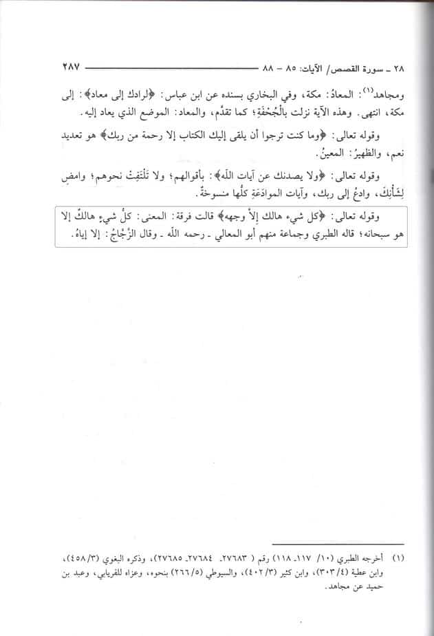 – Ici, il rapporte d’un groupe de savants et parmi eux, l’Imâm At-Tabari et l’Imâm Az-Zajjâj qui sont deux grand savant du Salaf et également de l’Imâm Abou-l Ma’âli Al-Jouwayni, l’explication du verset {koullou chay-in hâlikoun illâ wajhah}, et ces savants ont dit que « illâ wajhah » signifie « sauf Allâh ».