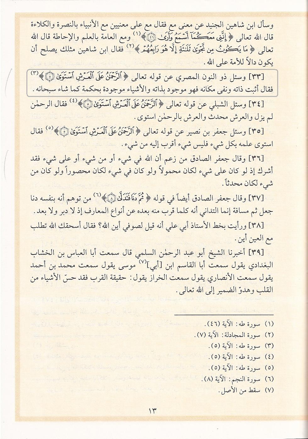 « و سئل ذو النون المصري عن قوله تعالى : « ٱلرَّحۡمَـٰنُ عَلَى ٱلۡعَرۡشِ ٱسۡتَوَىٰ ».