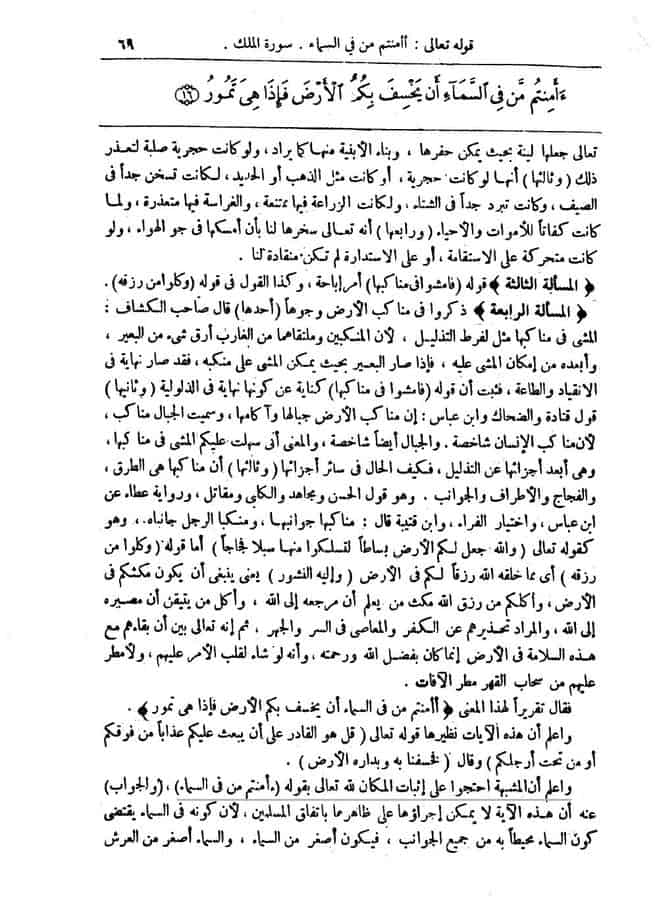 Dans son célèbre tafsîr connu sous le nom de « At-Tafsîrou l-Kabîr » (tome 30 page 69 de cette édition) lors de l’explication du verset 16 de soûrat Al-Moulk, l’Imâm Fakhrou d-Dîn Ar-Râzi a dit :