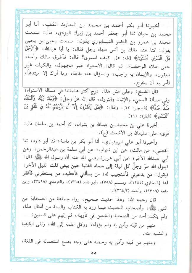 – Les wahhabites ont hérité cette croyance abjecte d’Ibn Taymiyah (moujassim) qui a également prétendu que Allâh serait assis. Article à consulter à ce sujet : L’Imam Abou Hayyan Al-Andalouçi dénonce l’égarement de Ibn Taymiyah.